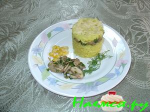 Рис слегка обжарить на ол.масле,залить водой(чтобы покрывала рис на 1палец). Когда вода вся выкипит,снять с плиты.Грибы мороженные залить холодной водой,довести до кипения,промыть и нарезать.В кастрюлю с толстым дном налить масло,положить грибы и слегка обжарить.Влить вино,довести до кипения и положить подготовленный рис.