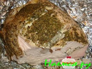 Завернуть в фольгу. Поставить в разогретую духовку на 60 минут. По истечении этого времени вынуть мясо, осторожно снять фольгу (из-за горячего пара), дать блюду остыть. Нарезать порционными кусками.
