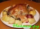 Лук мелко порезать, посыпать им курицу, сверху положитькусочки масла. Посолить, поперчить. Влить в форму апельсиновый сок. Запекать курицу 30 мин при 190".