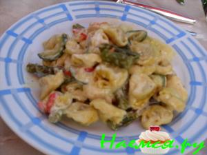 Тортеллини с беконом и цуккини в сливочно-сырном соусе