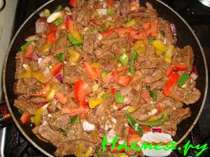 Мякоть говядины(вырезка) нарезать небольшими кусочками, отбить с двух сторон и сложить в эмалированную кастрюлю, посолив, поперчив, перемешав с 2 нарезанными луковицами и залить 100 гр. винного уксуса. Поставить в холодное место на 2-4 часа. В казанке, на небольшом количестве оливкового масла, обжарить до полуготовности 500 грамм шампиньонов с 2 луковицами и 1 морковкой.