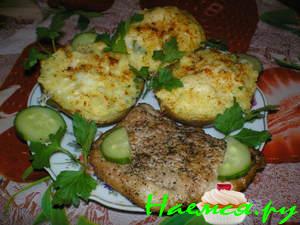 Картофель тщательно вымыть, завернуть каждую штучку в фольгу и запечь в духовке в течение часа. Срезать верхушки, вынуть мякоть. Мякоть сложить в кастрюльку, добавить немного молока и тертый сулугуни, подержать на маленьком огне немного, разминая в пюре. Добавить зелень, перемешать. Нафаршировать наши картофедльные "коробочки" достаточно плотно полученным пюре. Уложить каждую картофелину на "ложе" из фольги, посыпать тертым сыром, положить сверху по маленькому кусочку масла и запечь в духовке до появления легкой сырной корочки. Подавать на фольге.