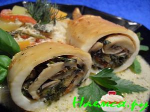 Грибы положить в огнеупорную форму. Сверху положить моцареллу завернутую в полосочки ветчины (или бекона). Убрать в духовку минут на 5-10, пока моцарелла немного не подплавиться.