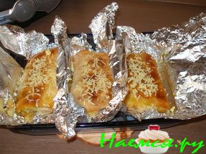 Отправляем в духовку на 15 минут. Вынимаем и сливочным маслом смазываем листья с рыбой. Закрываем крышкой ещё на 5 минут.