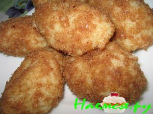 Обваливаем сначала в сухарях, потом в взбитых белках и снова в сухарях и жарим во фритюре.