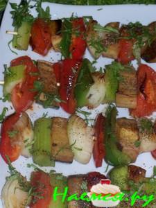 Для овощных шашлыков:Все овощи помыть,обсушить,нарезать и нанизать на шпажки поочерёдно.Обжарить на оливковом масле 5-6 минут.Сложить в противень без масла(на них вполне хватает масла) и поставть в духовку ещё на 10-15 минут на 170с.Достать и кушать горячими.Или остудить и приготовить салат.