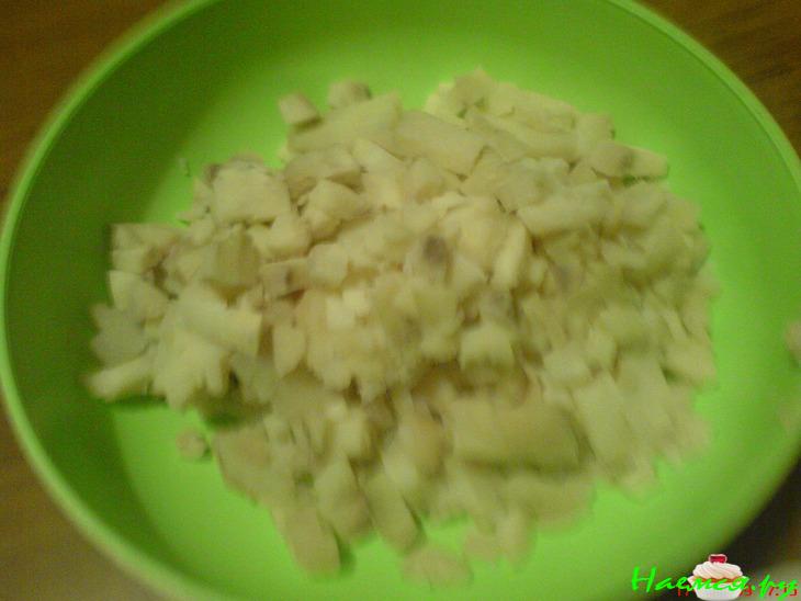 Отварной картофель нарезать кубиками.