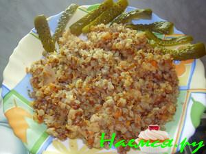Огонь включаем на полную мощность и даем воде выкипеть. Гречку, как и в плове рис, не мешаем.