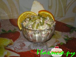 - Смешать мясо, овощи, грибы, добавить майонез, специи и тщательно перемешать