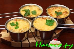 картофель почистить,нарезать кружками,обжарить до готовности.Лук порезать полукольцами,обжарить минут 10,затем к нему добавить грибы,посолить,жарить еще минут 5.Сметану смешать с мукой,солью и специями.Сыр мелко натереть.Выложить в горшочек сначала картошку,потом грибы с луком,сметану и присыпать сыром.Запекать минут 20.После духовки посыпать зеленью,накрыть крышкой и потомить