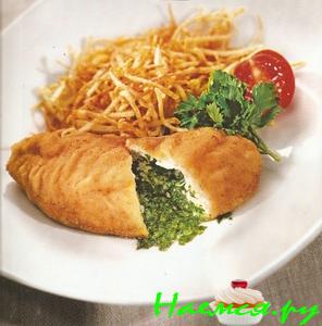 Яично-луковый фарш положить в середине котлеты, которую затем свернуть в форме батона, так чтобы косточка оказалась в середине котлеты, обвалять в муке, обмакнуть во взбитом яйце, равномерно обвалять в хлебе, нарезанном мелкими кубиками.