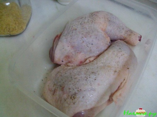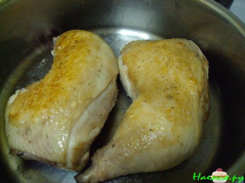 В сотейнике разогреть2/3 масла и обжарить курицу,разрезанную на порционные куски.