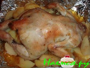 Через 20 мин. от начала запекания температуру снижаем до 160 гр. Держим до готовности картофеля, если курочка сильно зарумянивается, переворачиваем кусочки.