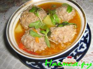 В говяжий фарш добавить лук,чёрный перец,1 яйцо,манку или хлеб,вымоченный в молоке.Фарш хорошо вымесить,посолить и отбить.Слепить тефтели,воткнуть в них сырые спагетти и потихоньку отпускать в казан с кипящим соусом,варить(тушить)до готовности,при подаче посыпать зеленью и чесноком..Для соуса:лук,морковь,болгарский перец,помидоры,всё нарезать,обжарить в раст.масле,добавить водички(+я добавила 1ст.томатного сока) посолить и довети до кипения.