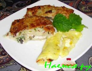 Взбить с молоком 4 яйца, добавив соль, перец и зелень. Из получившейся смеси приготовить 2 омлета на сливочном 5 масле. Раскатать тесто, края смочить водой. Положить обе омлета на тесто (они должны немного заходить друг на друга), оставив 2 см по краям свободными. Разложить рыбу на омлет. Тесто свернуть по длинному краю. Край смочить водой и положить на противень швом вниз. Верх рулета украсить фигурками, вырезанными из остатков теста. Смазать рулет взбитым яйцом. Выпекать 15-20 мин., пока рулет не подрумянится.