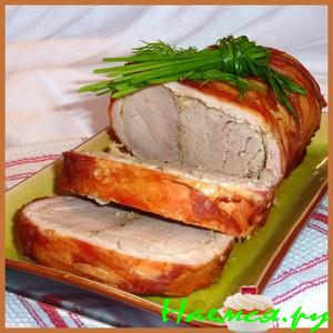 Аккуратно сворачиваем в рулет, поверх пропускаем полоску бекона (если необходимо, скрепляем шпажками или нитками) и подрумяниваем на сковороде.