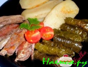 Прокрутить на мясорубке мясо и лук. Готовый фарш посолить , поперчить. Рис промыть , залить кипятком и дать постоять минут 30,чтобы он набух.Слить воду с риса и смешать его с фаршем. Виноградные листья промыть , залить водой и прокипятить 5-10 минут. В подготовленные виноградные листья заворачиваем фарш (как голубцы), сложить готовую долму в сотейник или большую сковороду. Налить воды, чтобы она хорошо закрывала долму.Воду немного подсолить.Поставить на плиту, как закипит убавить огонь и готовить на медленном огне до готовности 1час-1ч.20м..В процессе готовки следить, если вода выкипает, добавить ещё кипяточка.Подавать долму со сметаной . Если кто любит в сметану можно добавить чеснока и зелени.
