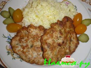 Форму смазать маслом и выложить отбивнушки. Картофель порезать соломкой и смешать с яйцом.Выложить на отбивнушки.