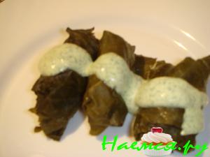 по 1 чайной ложке класть на виноградный листик и сворачивать трубочкой.Фарш класть на шерховатую сторону листа.