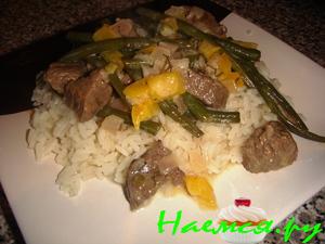 Сиазав сковороду небольшим количеством масла, обжарьте лук, паприку и грибы нас реднем огне до мягкости лука. Положите в кастрюлю с мясом, добавьте томатную пасту, бульон и 1/2 стакака воды. Довести до кипения, уменьшить огонь, тушить 10 минут.