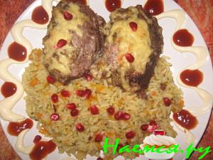 На отбитые кусочки мяса(которые в себя впитали и рассол и все остальное, отходов не было) поклала по 1 ч.ложке моркови с луком,сверху сыр.Свернула рулетики.