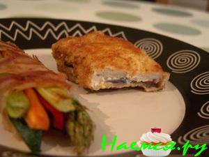 Мясо отбить в длину, натереть солью, перцем. БаклаЖан разрезать вдоль на 3 части, пересыпать солью оставить на 20 мин. затем промыть от соли, обсушить, полоЖить баклаЖан на мясо, завернуть рулетик. КаЖдыи рулетик завернуть в 2 ломтика грудинки. ОбЖарить на растительном масле со всеx сторон, довести до готовности в дуxовке или микроволновке. Грудинку лутше брать уЖе тонко нарезаную