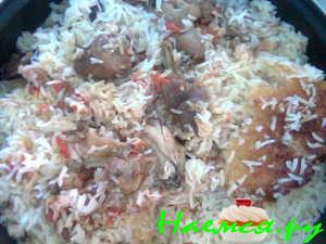 Через пять минут добавить воду(кипяток),посолить по вкусу,довести до кипения,убавить огонь и готовить до состояния,когда рис станет рассыпчатым.