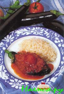 Начиняем баклажаны,сделав на пузе у них длинный прямой разрез от кочерыжки до кончика и ракрыв животик как можно шире.Они будут похожи на лодочки. Распределив их на противне, заливаем заранее приготовленным бульоном,с разведенной в ней томатной пасте,посоленной и поперченной. Украшаем сверху как душе угодно: у нас любят с жаренной картошкой,зеленым перцем и помидорами..и в духовку минут на 20-30 минут при температуре 150-170.