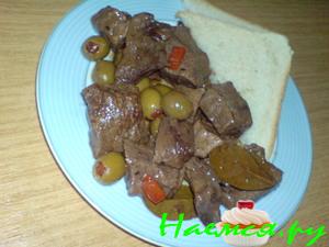 Добавить вино,острый перец, лавроый лист, душистый перец горошком. Пропарить минут 10 и влить в кастрюлю с телятиной. При необходимости добавить воды, чтобы все мясо было покрыто.