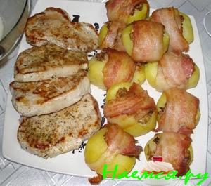 Вчера ждала гостей и думала чем бы их удивить, обычная картошка как то не интересно, а вот в виде шашлычка, да еще с бекончиком, не избито. Увидела идею у подруги у нее есть шашлычок из курочки, по-моему, в беконе.