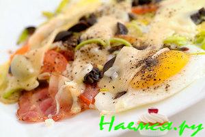 Вылить на горячую сковородку, разровнять на поверхности овощи, посолить, поперчить. Накрыть крышкой и оставить до полного приготовления.