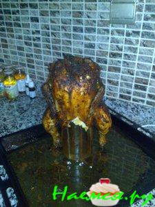Взять курочку помыть ощипать перышки, если что-то осталось после производителя, хорошо просушить курочку полотенцем. Взять плошку положить в него пол пачки масла сливочного мягкого в масло добавить специи, соль, карри, перец. При желании специи можно класть на свой вкус, или готовую смесь приправы для курицы. Все перемешать с маслом сливочным до однородной массы. Взять курочку и хорошенько всю целиком намазать готовой массой, посильнее промазать грудку, так как там мясо более сухое. Не жалейте масла. После того как все сделали положить курочку на решетку, решетку ставим на противень и в разогретую духовку до 200 гр. Примерно 40 минут. Время приготовления зависит от размера курочки.