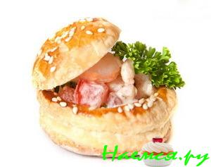 Кружки диаметром 5 см - они будут крышечками для валованов - сбрызнуть водой. Выпекать валованы и крышечки в духовке при температуре 180 градусов около 20 минут. Для начинки филе с грудки обжарить, затем пропустить через мясорубку или мелко порубить. Лук мелко порезать, обжарить на растительном масле, соединить с мясом, добавить измельченную зелень, приправить солью и смешать по вкусу со сметаной. Получившейся начинкой наполнить валованы и накрыть крышкой. Подавать можно и холодными и горячими.