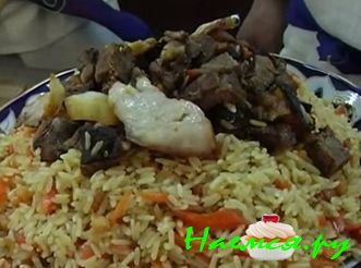 Мясо нарезаем кусочками и кидаем в казан в кипящее растительное масло. Готовое мясо вынимаем шумовкой. В это масло кладём мелко нарезанный репчатый лук, обжариваем его и выкладываем мясо обратно. Сверху морковь и немного воды. Далее рис, предварительно замоченный в воде на 2-3 часа. Добавляем воду так, чтобы она чуть покрыла сверху рис, и очень быстро солим, пока вода не ушла в рис. Размешиваем сверху только рис. Добавляем приправу для плова, красный перец, барбарис. Всё делаем на большом огне и без крышки, но когда начинаем упаривать рис, делаем малый огонь и накрываем крышкой.