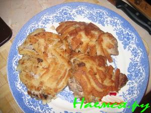 куриное филе прокрутить,добавить майонез,специи.обмакнуть в яице и обвалять в муке.придать форому шницеля и обжарить с двух сторон.из молока,яиц,муки и соли испечь блины.