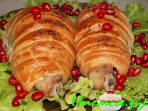- заверуть кожей голень и закрепить зубочистками ( тчательно заварачивать в кожу и закреплять зубочистками чтобы не высовывался сыр)