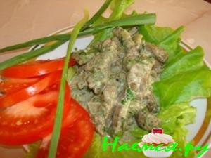 Печенку нарезать кубиками 2х2 см. Выдержать в течение 1 часа в маринаде: