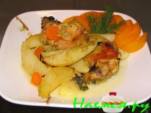 Цыплёнка выложить в форму,смазанную слив.маслом, залить полученным соусом и поставить в духовку 250 гр.на 40 мин.,после чего взбить белок 2-ух яиц,полить сверху и посыпать сыром.Запечь до готовности.Получается очень нежно и вкусно.