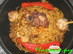 Порезав на средние куски баранину заложить в казан с луком и зажарить до золотистого цвета.