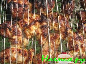Достала форму с бедрышками из духовки, залила соусом и отправила назад до полной готовности. А готовность определяю деревянной шпажкой - если легко проходит, то уже не сырое!