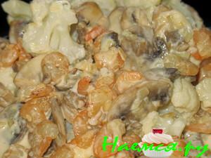 Шампиньоны порезать вдоль пополам, перец – кольцами. Цветную капусту разделить на соцветия. Лук-порей измельчить.