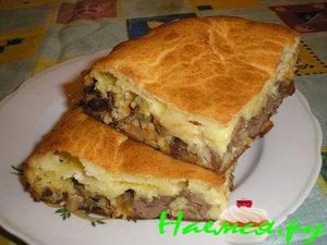 В форму вылить меньшую часть теста,сверху по всей поверхности теста разложить начинку. Сверху начинки вылить равномерно оставшееся тесто. Выпекать в духовке при 200гр.,30мин.До румяного цвета. Готовность проверить шпажкой.Время выпекания определяйте по особенностям вашей духовки.Когда пирог достанете из духовки,оставьте в форме минут на 15 остывать.Он очень мягкий и может поломаться.Потом я сняла кольцо с формы и перетащила пирог в месте с пергаментом на тарелку.!