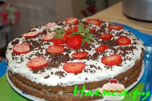 Форму смазать маслом, присыпать манкой. Выложить в форму половину теста. Поверх теста равномерно разложить шоколад, присыпать его корицей.
