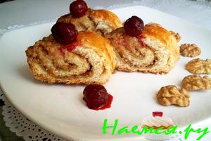 Тесто разделить на две равные части, каждую раскатываем в пласт толщиной около 7 мм. Сверху ровным слоем распределяем начинку, закатываем в рулет.