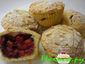 В подготовленные формочки (для маффинов) наливаем тесто примерно 1 полную ст.л.(чуть больше можна), затем кладём начинку примерно 1 ст.л., и закрываем снова ложкой теста(см.фото), аккуратно вилкой пройтись(потыкать) по поверхности пирожка, верх припорошить кунжутными семечками.