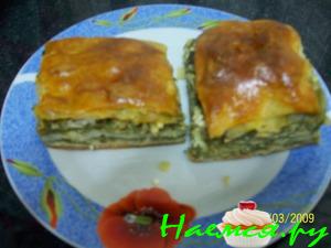 .Потом этот лист с брынзой складываем в форму гармошки, и ставим в намазанную квадратную форму.и так все листы,и складываем в форму рядышком одна возле другой.