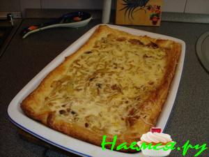 Нарежьте полукольцами лук спассируйте до легкого золотистого цвета, добавьте грибы, немного обжарьте и все также , как и в первом пироге, но сыр здесь будет очень кстати.
