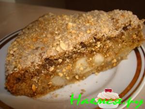Тесто раскатать и положить в форму. Сверху разложить дольки груши, присолить, посыпать паприкой, орехами и сыром.