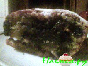 Ягоды, не размораживая, пересыпать мукой. Яйца взбить с сахаром, добавить майонез, перемешать, всыпать соду и муку, хорошо перемешать. Выложить ягоды в тесто и быстренько взбить миксером. Вылить массу в смазанную форму (d=20-22см) и печь в разогретой духовке 20-30 минут. Ещё горячий пирог смазать мёдом и посыпать пудрой, а затем какао.