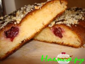 Готовый пирог смазать джемом и взбитыми сливками.